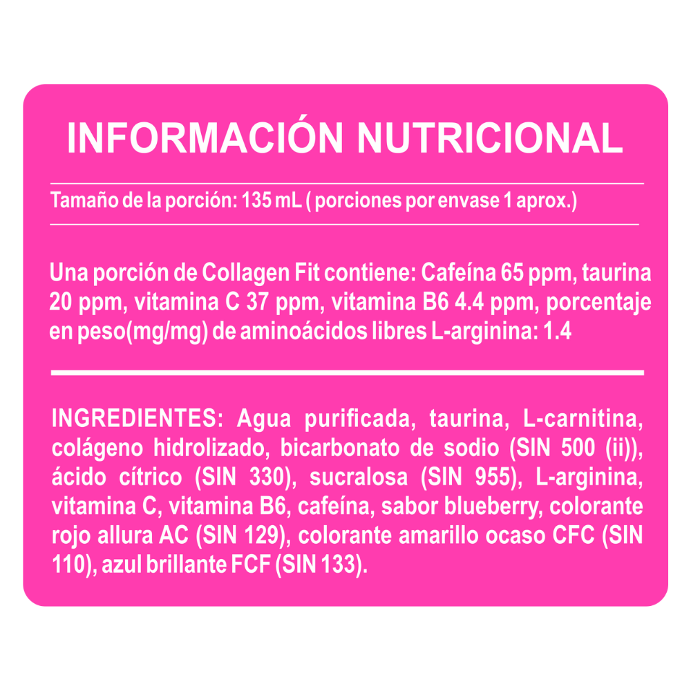 COLLAGEN FIT ha sido diseñado especialmente para el organismo de la mujer en el rendimiento de la actividad física a la hora de hacer ejercicio, esto se debe a que contiene CAFEÍNA, TAURINA, COLÁGENO Y L-ARGININA. Se le ha adicionado VITAMINA C, VITAMINA B6 y gracias a su aporte de L-CARNITINA te ayudará a reducir los niveles de grasa, mejorando el rendimiento en deportes donde se necesita una explosión de energía súbita y baja, mejorando los niveles de energía por lo que te sentirás más activa durante todo el día.